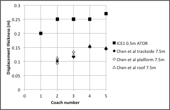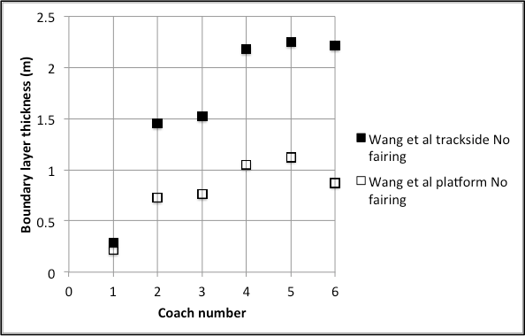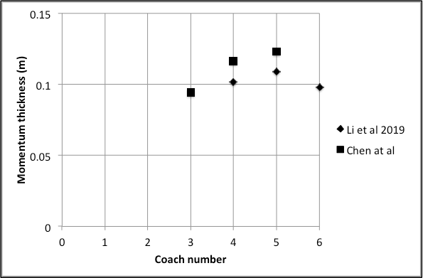The CFD studies all used DES or IDDES techniques. That of Wang et al (2020a) looked at the effect of simulating rails in CFD simulations of a two-coach high speed train, and although mainly concerned with wake flows, does present some boundary layer measurements. Wang et al (2020b) investigated the difference between the use of conventional and Jacobs (articulated) bogies for a three coach high speed train. Again, it is mainly concerned with the effect on the wake, but it does show that the use of Jacobs bogies results in a thinner boundary layer on the side of the train and reduced aerodynamic drag. Guo et al (2020) describes an investigation into the effect of the inter-unit gap between two coupled three care high speed trains. As would be expected from recent full-scale tests, an increase in boundary layer velocities is observed in the vicinity of the gap, with a significant thickening of the boundary layer on the downstream unit. Liang et al (2020c) investigated the effect of ballast shoulder height on the boundary layer and wake development of a four-coach train. Little effect on boundary layer was observed either on the train walls or roof. Finally, Tan et al (2020) carried out IDDES calculations for 2, 4 and 8 car Maglev trains. Unsurprisingly the boundary layer grew to be thicker along the eight-coach train than along the others. The maximum slipstream velocity increased with train length at platform level but was greatest for the four-coach set lower down the train.