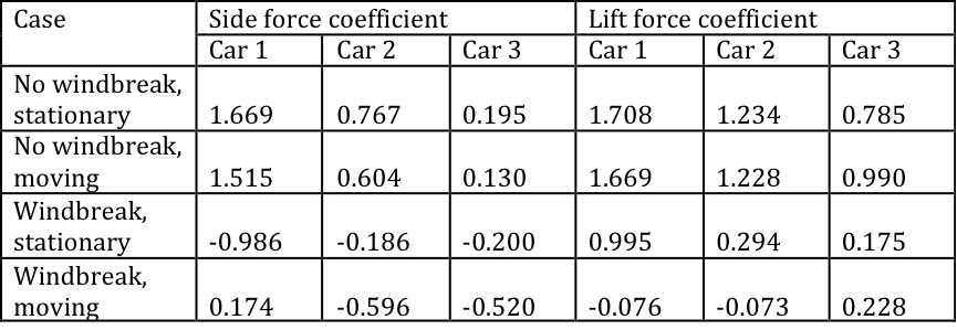 In a series of five papers, a group from China has investigated “Braking Plates”, flat plates that are lifted into a vertical position on the train roof in order to increase aerodynamic drag and act as brakes. All the papers describe IDDES CFD investigation on various geometric configurations of high-speed trains. Niu et al (2020a) calculated the forces on a two car train and showed that the increased drag was more significant when the plate was on the centre of the roof rather than in an intercar gap. Niu et al (2020b) contains very similar material but with more flow field detail around the plates and the vehicle more generally. Niu et al (2020c) looked at the interaction between rooftop equipment such as HVAC units and pantographs, and the highly unsteady turbulent wake behind the plates. These interactions were found to be small. Niu et al (2020d) investigated the behaviour of plates near the nose and tail of vehicles in a two coach train, and showed that those near the nose were more effective in increasing drag than those near the tail, with the latter significantly affecting the vortices in the train wake. Finally, Zhai et al (2020) calculated the flow over the roof of the train only and studied in detail the highly unsteady flow field caused the raising and lowering of braking plates at zero and ten degrees yaw. Whilst this concept is interesting, more work is required to determine how multiple plates would work together on longer more realistic trains – are the drag benefits significant in terms of the drag of the whole train. Also, the question remains as to how effective they would be in an actual braking process. Work is required to model the slowing down on trains using both conventional and aerodynamic methods to find out the speed range over which the braking plates make a significant contribution to overall braking forces.