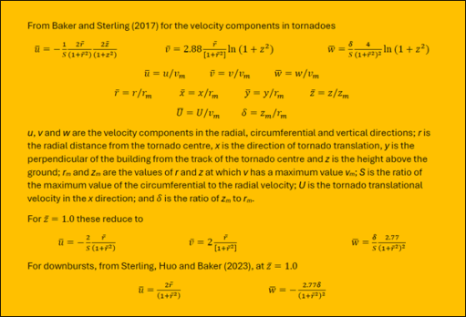 Here we use the latter method (which will come as no surprise to those who know me!). Specifically we use the methods of Baker and Sterling (2017) and Sterling et al (2023). These give the equations for the three components of velocity, relative to the tornado / downburst centre, shown in Box 1. It is then assumed that the building is stationary as the storm passes over it and the overall horizontal velocity and horizontal and vertical flow directions calculated from assuming a vector sum of a steady wind velocity in the storm direction of travel and the velocity induced by the tornado / downburst (figure 1).