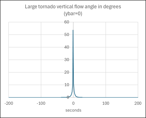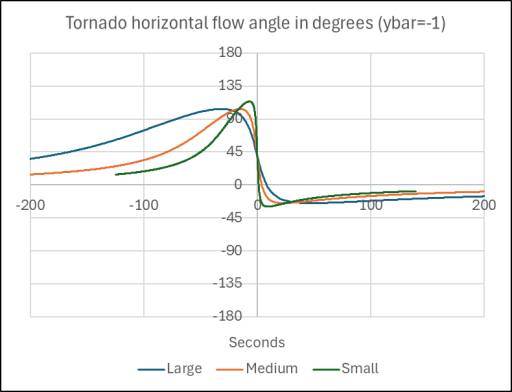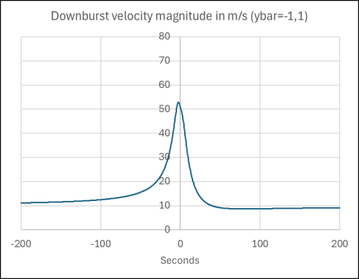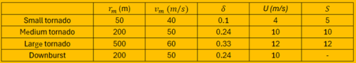Clearly the model requires a number of parameters to be specified. These have been taken from the data collation of Baker and Sterling (2019) (which was compiled to assess the adequacy of tornado vortex generators) and four conditions specified – for small, medium and large tornados and for a downburst of similar size to a medium tornado. The parameters for these cases are shown in Table 1. I make no claim as to the overall adequacy or otherwise of this method – as it stands it is simply a convenient tool with which to investigate the broad parameters of the problem, and other methodologies could be used to determine the wind conditions relative to a building.