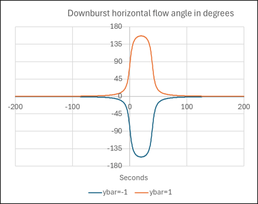 - For the downburst, the horizontal direction variation differs in sign between the two positions but are otherwise identical. However, for the tornado cases the horizontal direction variation is different for the two building positions due to the asymmetry introduced by the rotation of the storm. For the case with the building to the top of the storm track in figure 1, there is a steady, if rapid, change of direction around the building and back to the starting point. For the bottom case, the flow directions move through 130 degrees and then back to the original position.