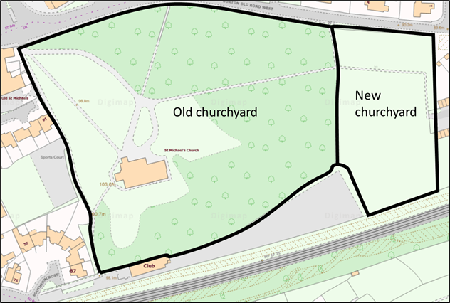 The churchyard of St Michael on Greenhill in Lichfield is very large and of some antiquity, with indications that it was a place of worship well before the Conquest. Today it comprises two sections – the old churchyard, which was formally closed to new burials in the late 1960s, and the new churchyard, which opened in 1944 and is still in use, although burial space is becoming very restricted. Both contain numerous graves and monuments and are of considerable interest to both historians and those involved in family history research. This webpage thus collates a range of material from Burial Registers, Grave and monument surveys etc. into a downloadable spreadsheet that it is hoped will prove of interest and use to family history researchers and to others. This has been a very considerable task requiring a complex analysis of the sources, and it is inevitable that there will be errors or omissions. If the reader comes across anything that looks odd, do let me know on bakerc54@gmail.com and I will investigate.