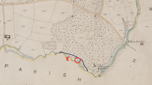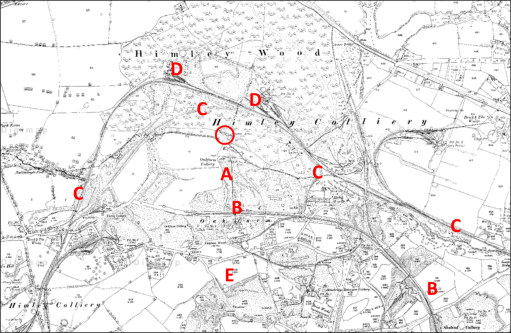 Figure 1 shows a modern Ordnance Survey map of the area. The Crooked House is indicated by a red circle on this figure and the ones that follow, which, unless otherwise stated, all show the same area to the same scale. The site of the Crooked House is situated on the north bank of the Himley Brook that flows east to west from the Old Park / Russell’s Hall area to the River Smestow, at the end of a mile long lane that leaves the Himley to Dudley Road just to the east of Askew Bridge (A). Footpaths from the site go north through Himley Wood (B), and south across an area of reclaimed industrial land (C) and the old GWR Kingswinford branch line (D) to Oak Lane (E), where there are various small-scale industrial businesses. But the area that we see now is very different from how it would have looked a hundred years ago, which itself was very different from how it would have looked a hundred years before.