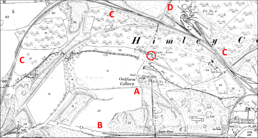 Figure 5 is taken from the Coal Authority web site and shows the mine entries that have been documented around the Crooked House. The cluster to the south of the Himley Brook (A) were part of the Oak Farm Collier and were in use from the 1860s to 1880s, and if mining subsidence caused the Crooked House to take on its iconic character before its destruction, the mines in this area are the cause.