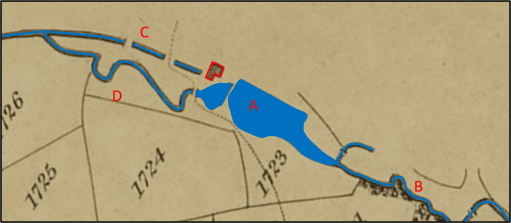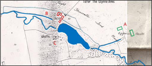 Figure 6, dating from sometime in 1841, is an extract from the Himley Tithe map. It can be seen that there have been some changes. The channel from Coppice Mill pool seems to have been replaced by one leaving the Coppice Mill pool at the north western corner (A), presumably connecting by an underground sough to the new pool on the north side of the Oak Mill pool (B). Alternatively these channels might simply represent construction phase of the new watercourse system that will be described below. This channel is distant from the Coppice Mill buildings and suggests that it is not intended as a channel to feed the mill, but rather to act as an overflow to the Coppice Mill pool, or to increase the flow to the Oak Farm Mill pool. There is perhaps an indication on Figure 6 of a channel corresponding to the mill race position (C), but this is not totally clear. The Oak Farm Mill is again shown by a simple rectangular building – again probably a simple schematic representation.