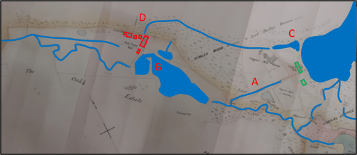 Figure 8, produced for the Dudley Estate, has notes referring to the removal of some trees in 1849 and can probably be dated soon after that, perhaps the early 1850s, as the mill pool shape is similar to that of Figure 7.. The Coppice Mill race is clearer (A), and there have been some changes to the shape of the Oak Farm Mill pool (B). The major change, however, has been to the channel from the northern corner of Coppice Mill pool (C) which has now been extended as a surface channel with a sharp turn to approach Oak Farm Mill from a northerly direction (D). This looks to be a new mill race, bringing water from the higher Coppice Mill pool to the Oak Fame mill, which is here shown as a number of separate buildings, with the original mill building to the south. The change in direction would either have meant a complete rebuild of the original mill building to accommodate a new water wheel on its western side, or perhaps the relocation of the mill to the building to the north (the later public house) with a new mill wheel on its western side.