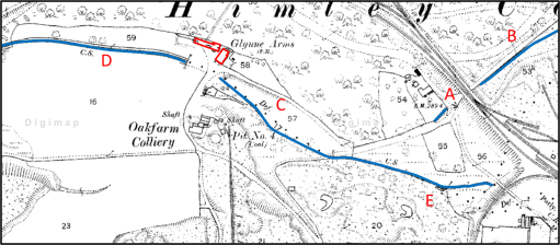 Figure 9 is the Ordnance Survey map of 1882. The situation can be seen to have changed completely with the topography being much changed by mining and other industrial activities and the development of the railway network. The Coppice Mill buildings (A) , and the Coppice Mill pool no longer exists (B), although there is a stream running through its location that runs underground to a junction with Himley Brook. In place of the mill there is a branch of the Earl of Dudley’s railway. Similarly, the Oak Mill pool is now longer visible (C), and the Himley Brook has been channeled, and west of the Oak Farm Mill (now named the Glynne Arms) runs along the old Oak Farm Mill race (D). The eastern end of the Himley brook now presumably runs underground (E). The original (southern) Oak Fam Mill building is no longer visible.